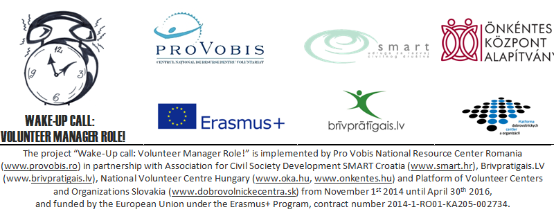 Između studenog 2014. i travnja 2016., Udruga za razvoj civilnog društva SMART, u partnerstvu s organizacijama Pro Vobis iz Rumunjske, Nacionalnim volonterskim centrom OKA (Mađarska), Platformom volonterskih centara i organizacija (Slovačka) i Nacionalnim volonterskim centrom Brīvprātīgais.lv (Latvija), provodi projekt Wake-Up Call: Volunteer Manager Role (Poziv na buđenje: uloga koordinatora volontera).
