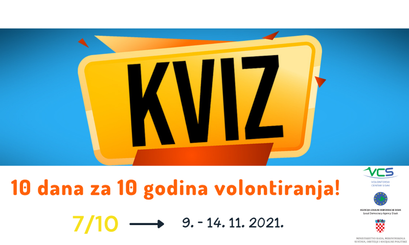 Zaigrajte mali online kviz o volontiranju kojim ćete se zabaviti i saznati neke nove zanimljive činjenice. Ovo je kviz znanja, ali i brzine tako je pobjednik_ca osoba koja najbrže ispravno odgovori na pitanja. Pobjednik_ca nagradnog natječaja dobiva promotivnu majicu.