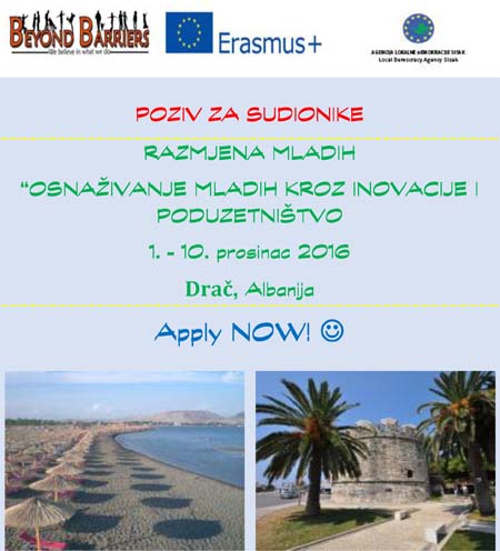 Agencija lokalne demokracije Sisak poziva mlade s područja Siska i bliže okolice na sudjelovanje u razmjeni mladih pod nazivom RAISE – Raising the Advantages of Youth through Innovation and Social Entrepreneurship” koja će se održati u Draču (Albanija) od 1. do 10. prosinca 2016. godine. Početak putovanja 30. studeni, povratak 11. prosinca 2016.