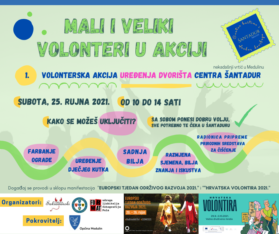 Popis svih volonterskih aktivnosti koje će se održati u sklopu manifestacije možete pronaći na sljedećoj poveznici, te vas pozivamo da pronađete aktivnost koja vas inspirira, povedete članove i članice vaših obitelji i zavolontirate se s nama! Manifestacija Hrvatska volontira ove se godine održava od 29. rujna do 2. listopada, a ovogodišnjom kampanjom želimo podsjetiti koliko nam je volontiranje važno za razvoj otpornosti zajednice u izvanrednim situacijama te koliko naše zajedništvo i solidarnost ubrzavaju proces oporavka za vrijeme i nakon krize.