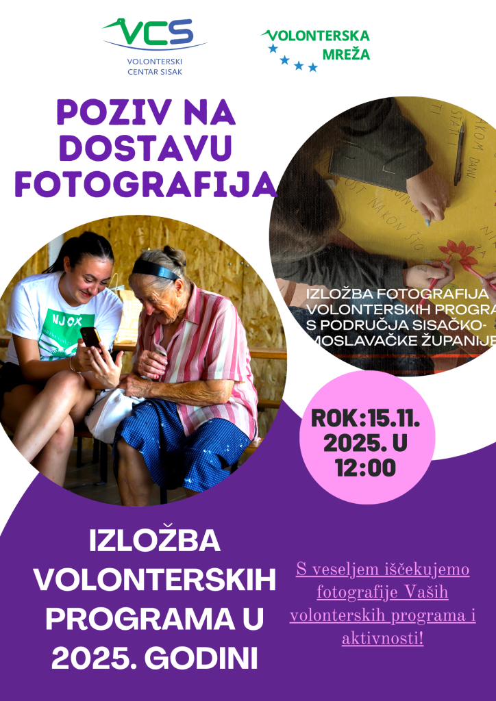 Pozivamo organizatore volontiranja s područja Sisačko-moslavačke županije da dostave fotografije volonterskih programa koje su provodili kroz 2025. godinu. Odabrane fotografije volonterskih programa biti će dio izložbe.